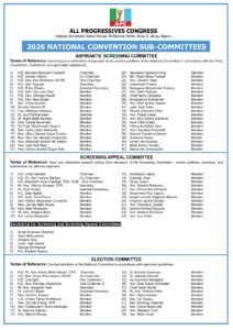 The All Progressives Congress (APC) has approved the composition of Sub-Committees for the upcoming 2026 National Convention, as part of preparations to ensure a transparent and credible Convention.